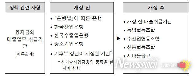 이번 개정안은 재생에너지 정책융자 취급기관(현재 15개 기관)에 지역과 밀접한 4개 금융기관 추가를 주요 내용으로 하고 있다.
