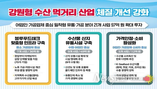 뉴스펀치 조평훈 기자 | 강원특별자치도는 수산 먹거리 산업을 단순 생산 중심 구조에서 벗어나 가공·유통·소비로 이어지는 블루푸드테크(Blue Food-Technology) 산업화와 연계해 총 21개 사업, 97억 원 규모의 종합 지원책을 본격 추진한다.