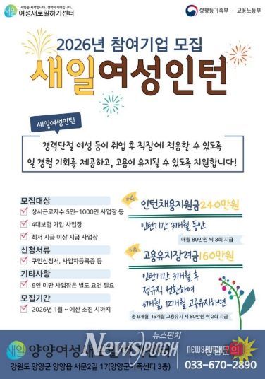 뉴스펀치 조평훈 기자 | 양양여성새로일하기센터는 여성들의 안정적인 고용과 직장 적응을 지원하기 위해 '새일여성인턴 사업'에 참여할 기업과 경력단절 여성 12명을 상시 모집하고 있다.