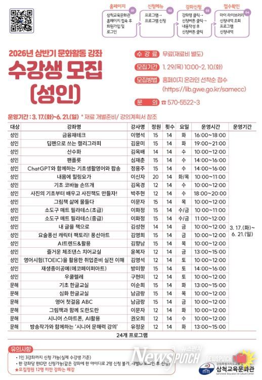 뉴스펀치 조평훈 기자 | 삼척교육문화관은 3월 17일부터 6월 21일까지 운영되는 ‘2026년 상반기 문화활동강좌’를 수강생을 모집한다.