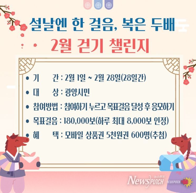 뉴스펀치 최영남 기자 | 광양시는 시민의 건강 증진과 걷기 실천 확산을 위해 오는 2월 1일부터 2월 28일까지 건강걷기 실천 모바일 걷기 앱 ‘워크온’을 활용한 ‘설날엔 한 걸음, 복은 두배! 2월 걷기 챌린지’를 운영한다고 밝혔다.