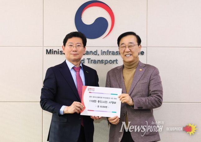 뉴스펀치 박상훈 기자 | 이상일 용인특례시장은 26일 오후 정부세종청사에서 김윤덕 국토교통부 장관에게 ‘용인 첨단시스템반도체 국가산단’과 ‘용인반도체클러스터 일반산단’이 계획대로 진행돼야 한다는 뜻이 담긴 용인특례시민들의 서명부를 전달했다.