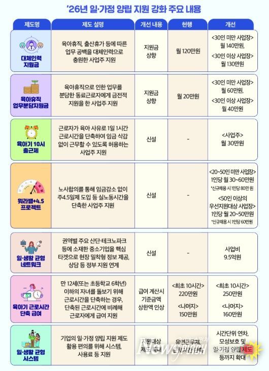 고용노동부는 최근 중소기업의 일‧가정 양립에 대한 지원을 집중적으로 확대해 나가고 있다. 출산휴가나 육아휴직 등으로 발생하는 인력 공백을 보완하기 위해 대체인력을 채용한 사업장에 지급하는 대체인력지원금은 현재 월 최대 120만원에서 올해부터는 30인 미만 사업장은 월 140만원, 30인 이상 사업장은 월 130만원으로 인상했다.