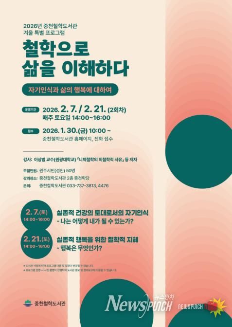 뉴스펀치 조평훈 기자 | 원주시 중천철학도서관은 오는 2월, 시민을 대상으로 겨울 특별 철학 프로그램 ‘철학으로 삶을 이해하다–자기인식과 삶의 행복에 대하여’를 운영한다.