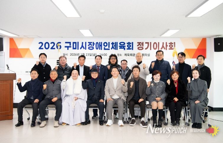 뉴스펀치 박세훈 기자 | 구미시장애인체육회는 지난 23일 구미시 체육회관에서 2026년 정기 이사회를 열고, 임원 인사와 함께 새해 사업 방향을 확정했다. 이날 이사회에는 김장호 구미시장을 비롯해 김형식 상임부회장 등 임원 20명이 참석했다.