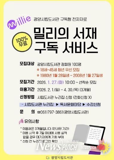 뉴스펀치 김용희 기자 | 광양중앙도서관이 청년층의 독서 습관 형성과 온라인 독서문화 확산을 위해 전자책 구독 서비스 ‘밀리의 서재’ 참여자를 모집한다.