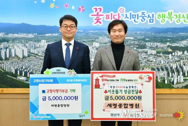 뉴스펀치 박세훈 기자 | 의료법인 서명의료재단 세명종합병원은 26일 경산시청을 방문하여 이웃돕기 성금 500만 원과 고향사랑 기부금 500만 원을 각각 기탁했다.