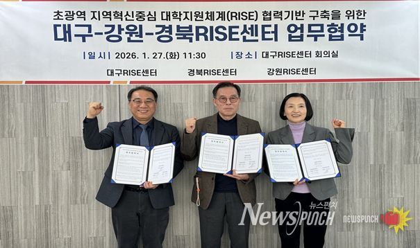 뉴스펀치 조평훈 기자 | 강원라이즈(RISE)센터(센터장 김미숙)는 1월 27일 대구라이즈센터 회의실에서 대구라이즈센터(센터장 최정건), 경북라이즈센터(센터장 박대현)와 ‘초광역 RISE 협력체계 구축을 위한 업무협약’을 체결했다고 밝혔다.