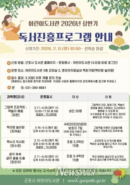 군포시 어린이도서관 관계자는 “이번 봄학기 독서진흥프로그램은 어린이들이 또래와 함께 독서 역량을 키울 수 있도록 기획했으며, 성인강좌를 통해 가정과 도서관이 함께하는 독서환경을 조성하고자 한다”며 “시민들의 많은 관심과 참여를 바란다”고 말했다.