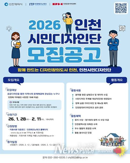 뉴스펀치 정홍균 기자 | 인천광역시는 1월 28일부터 2월 11일까지 시민 중심의 공공디자인 혁신을 이끌 ‘인천시민디자인단’을 모집한다고 밝혔다.