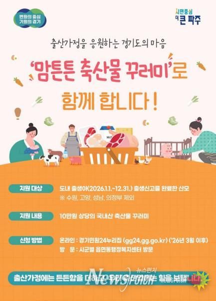 ‘맘튼튼 축산물 꾸러미’지원 사업은 2026년 파주시에서 출생신고를 마친 산모를 대상으로 10만 원 상당의 축산물 꾸러미를 제공하는 사업으로, 출산 후 산모의 영양 보충을 돕고 지역 축산물 소비를 활성화해 축산 농가의 경영 안정을 도모하기 위해 마련됐다.