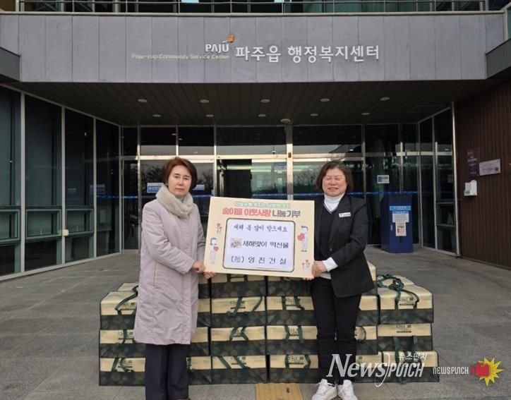 장연희 파주읍장은 “매년 이웃 돕기를 통해 소외계층에게 지속적으로 사랑의 온정을 전해주시는 영진건설에 깊이 감사드린다”라며 “기탁된 선물은 도움이 필요한 이웃들에게 정성껏 전달하겠다”라고 밝혔다.
