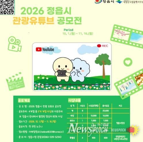 뉴스펀치 정홍균 기자 | 정읍의 관광자원과 일상적 매력을 전국에 알리기 위해 정읍시가‘2026 정읍시 관광 유튜브 공모전’을 개최한다.