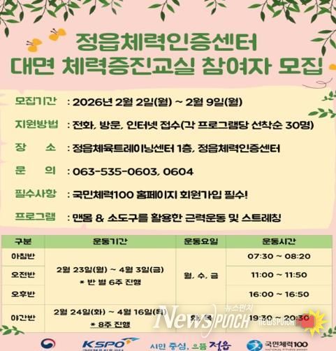 뉴스펀치 정홍균 기자 | 정읍체력인증센터가 시민들의 건강한 삶을 지원하고 체계적인 체력 관리를 돕기 위해 ‘2026년 대면 체력증진교실 1기’ 참여자를 오는 2월 2일부터 9일까지(주말 제외) 선착순으로 모집한다.
