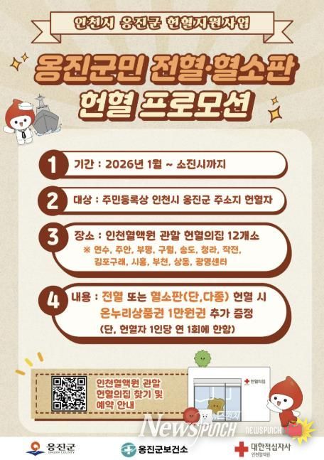 뉴스펀치 정홍균 기자 | 옹진군은 지난 28일, 생명 나눔 문화 확산과 혈액 수급의 안정을 돕기 위해, 올해부터 ‘헌혈 장려 사업’을 본격 추진한다고 밝혔다.