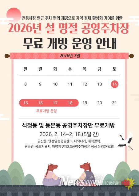 뉴스펀치 박상훈 기자 | 안성시시설관리공단은 2026년 설 명절을 맞아 2월 14일부터 18일까지 5일간, 공단이 관리하는 공영주차장 중 전통시장 인근에 위치한 석정동 공영주차장과 동본동 공영주차장을 한시적으로 무료 개방한다고 밝혔다.