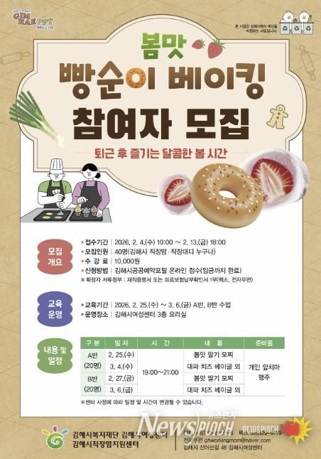 뉴스펀치 박세훈 기자 | (재)김해시복지재단 직장맘지원센터는 김해시 직장맘·대디를 위한 퇴근 후 베이킹 프로그램 『봄맛, 빵순이 베이킹』 참여자를 모집한다.