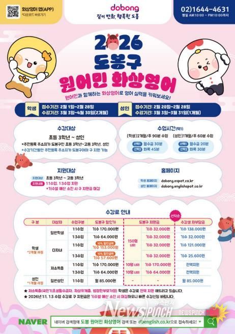 뉴스펀치 박상훈 기자 | 서울 도봉구가 지역 내 초‧중‧고 학생에게 원어민 화상영어학습 수강료를 지원한다.