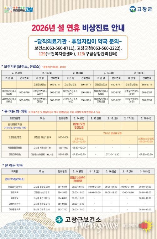 뉴스펀치 최영남 기자 | 고창군이 설 연휴(14~18일) 군민의 건강을 지키고, 의료 이용 불편을 최소화하기 위해 비상진료체계를 가동한다.