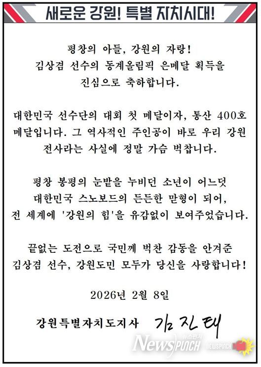 뉴스펀치 조평훈 기자 | 김진태 도지사는 8일 2026 밀라노-코르티나담페초 동계올림픽대회에서 강원특별자치도(하이원 스포츠단) 소속 김상겸 선수의 남자 스노보드 평행대회전 은메달 획득을 축하하며, 축전을 보냈다.