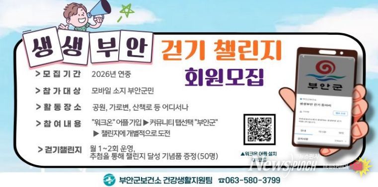 뉴스펀치 최영남 기자 | 부안군보건소는 군민의 일상 속 걷기 실천을 활성화하고 건강생활실천 문화를 확산하기 위해 시공간의 제약 없이 스마트폰으로 누구나 쉽게 참여할 수 있는 모바일 걷기 앱 ‘워크온(WalkOn)’을 활용한 생생부안 걷기 챌린지 회원을 매월 모집한다고 밝혔다.