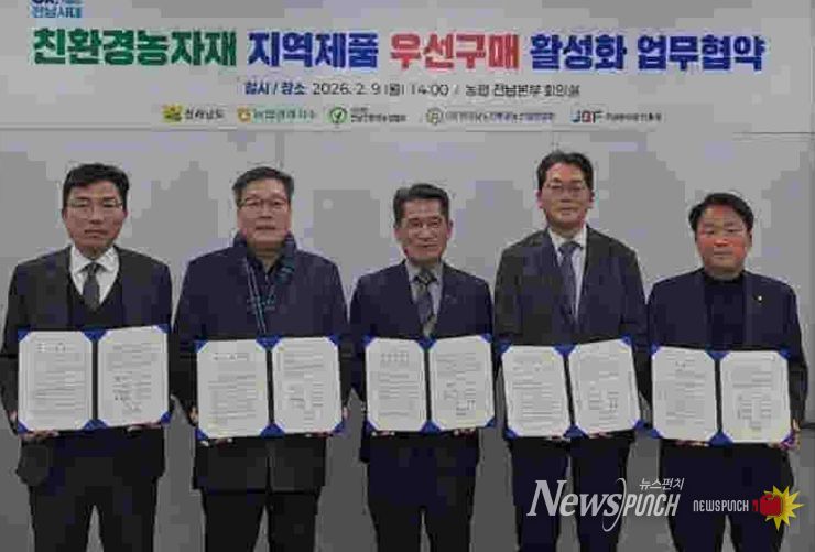 뉴스펀치 최영남 기자 | 전라남도는 9일 농협중앙회 전남본부에서 지역에서 생산한 친환경농자재 우선 구매 확대를 위한 민·관·학 업무협약을 하고, 지역 내 생산-소비가 이어지는 선순환 체계 구축에 나섰다.