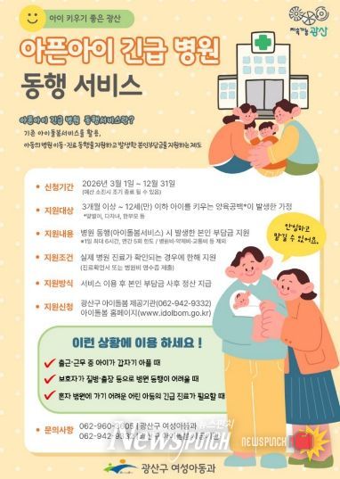 뉴스펀치 최영남 기자 | 광주 광산구가 3월 1일부터 부모가 곁에 없거나 돌봐주기 어려운 상황에서 갑작스럽게 진료가 필요한 아동을 위한 ‘아픈 아이 긴급 병원 동행’ 서비스를 시행한다.