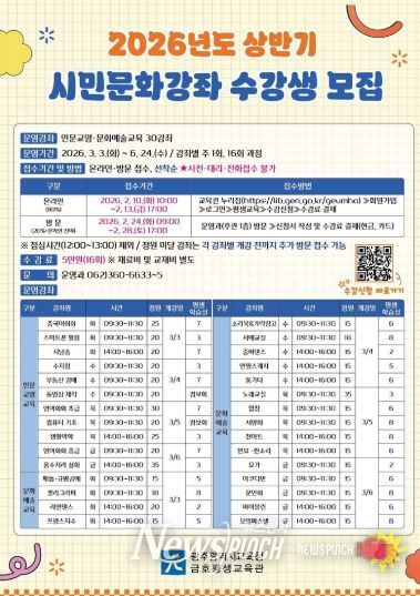 뉴스펀치 최영남 기자 | 광주시교육청금호평생교육관은 오는 3~6월 ‘2026년 상반기 시민문화강좌’를 운영한다.