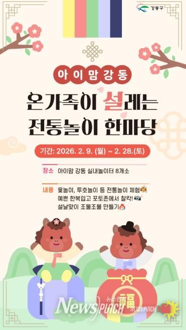 뉴스펀치 박상훈 기자 | 서울 강동구는 다가오는 설 명절을 맞아 관내 ‘아이맘 강동’ 8개소 실내놀이터에서 아이와 가족이 함께 즐길 수 있는 전통문화 체험 프로그램을 운영한다고 10일 밝혔다.