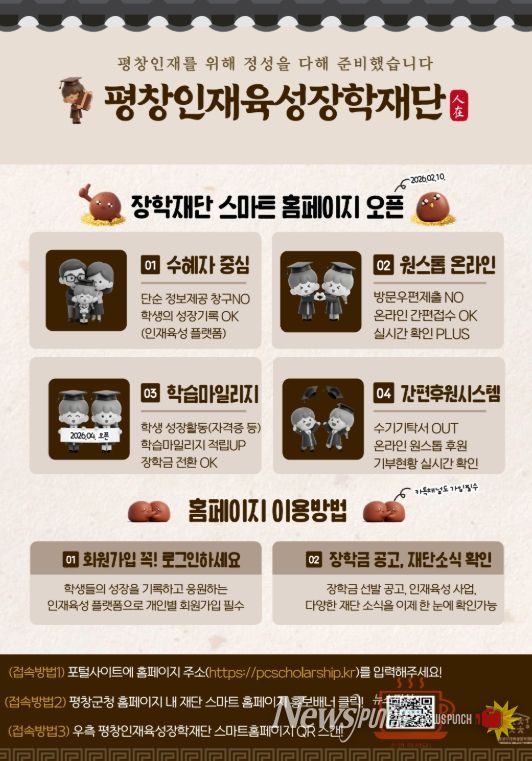 뉴스펀치 조평훈 기자 | (재)평창인재육성장학재단이 장학 행정의 효율성을 높이고 수요자 맞춤형 서비스를 제공하기 위해 10일 공식 홈페이지를 오픈하고 본격적인 운영에 들어간다.