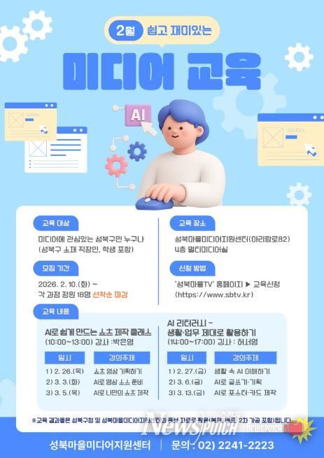 뉴스펀치 박상훈 기자 | 서울 성북구 성북마을미디어지원센터가 2월 10일부터 AI 활용 미디어 교육 수강생을 선착순으로 모집한다.