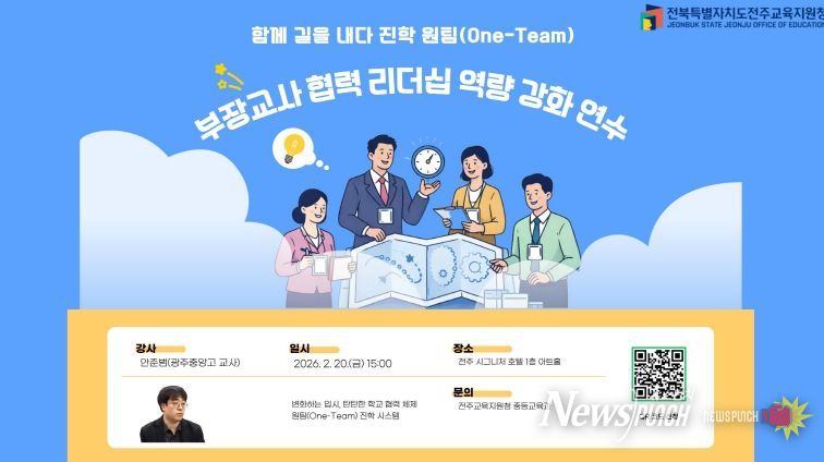 뉴스펀치 최영남 기자 | 전북특별자치도전주교육지원청은 오는 20일 전주시그니처호텔에서 관내 고교 부장 교사를 대상으로 ‘진학 원팀(One-Team) 부장교사 협력 리더십 역량 강화 연수’를 운영한다고 10일 밝혔다.