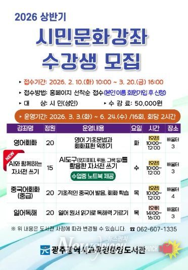 뉴스펀치 최영남 기자 | 광주광역시교육청중앙도서관은 오는 3월 3일부터 6월 24일까지 도서관 배움터실 등에서 ‘2026년도 상반기 시민문화강좌’를 운영한다.
