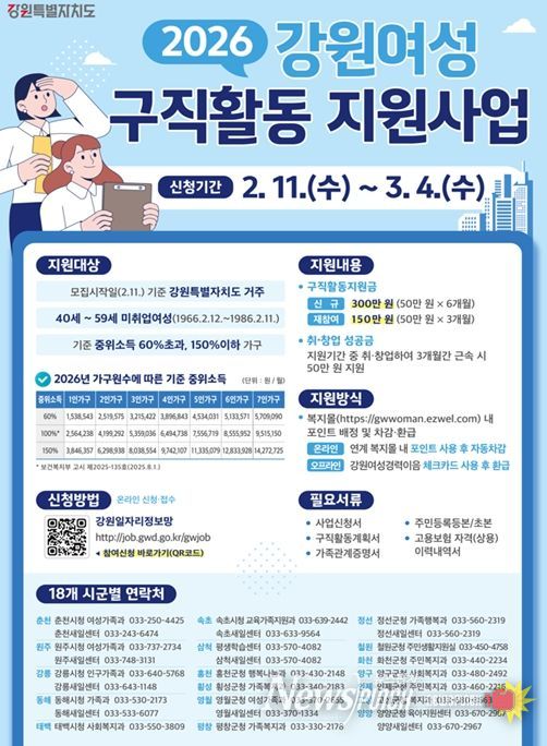 신청 자격은 모집 시작일인 2월 11일 기준 강원특별자치도에 거주하는 40세 이상 59세 이하(1966.2.12.~1986.2.11.)의 경력단절 미취업 여성으로, 기준중위소득 60% 초과 150% 이하 요건을 충족해야 하며
