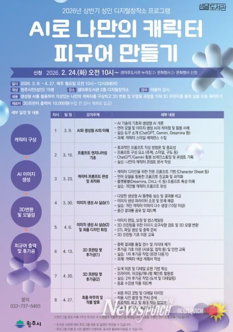 뉴스펀치 조평훈 기자 | 원주시 샘마루도서관은 서부권 시민들의 디지털 창작 역량 증진을 위해 오는 3월부터 ‘상반기 성인 디지털창작소 프로그램’을 운영한다.