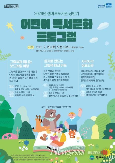 뉴스펀치 조평훈 기자 | 원주시 샘마루도서관은 오는 3월과 4월, 관내 어린이를 대상으로 ‘상반기 어린이 독서문화 프로그램’을 운영한다.