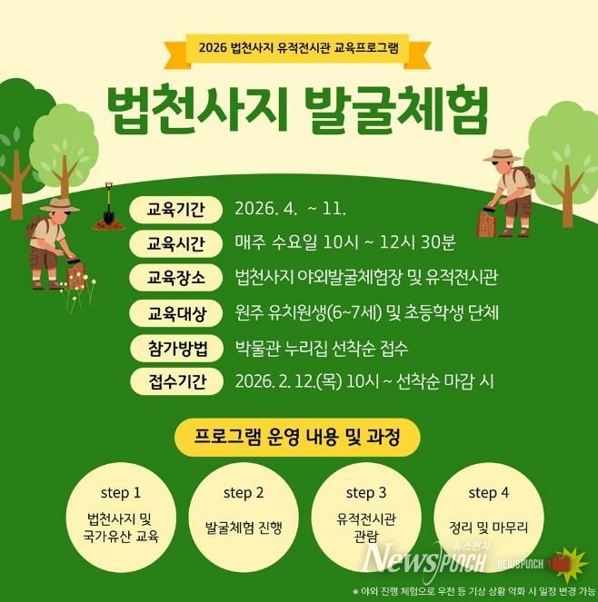 뉴스펀치 조평훈 기자 | 역사박물관(관장 남기주)은 법천사지 유적전시관에서 2026년 법천사지 발굴 체험 등 교육프로그램을 운영한다.