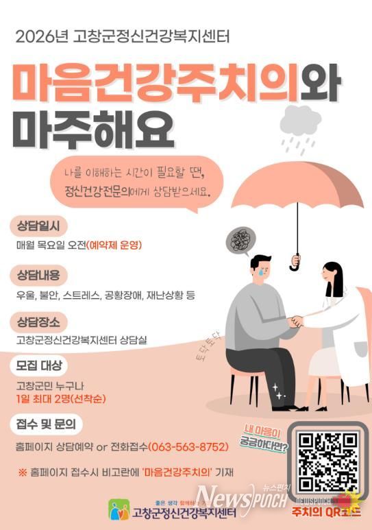 뉴스펀치 정홍균 기자 | 고창군 정신건강복지센터가 지역주민의 마음 건강 증진을 위해 2026년 마음건강주치의 사업을 운영하고 있다.