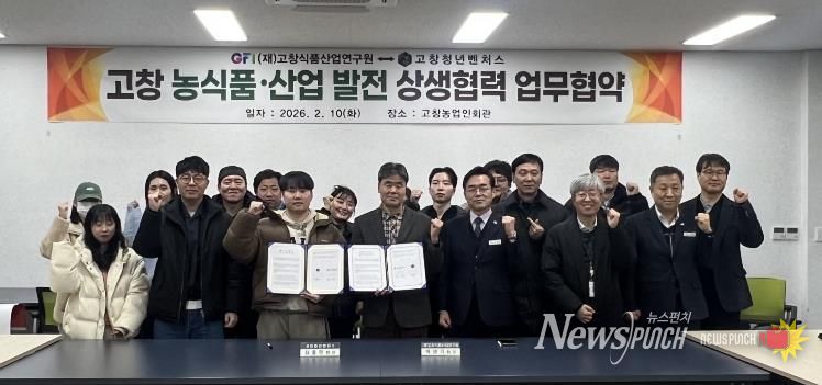 뉴스펀치 정홍균 기자 | (재)고창식품산업연구원과 고창청년벤처스가 지난 10일 저녁 고창군농업인회관에서 고창군의 지속 가능한 발전과 청년 창업 생태계 활성화를 위한 업무협약(MOU)을 체결했다고 밝혔다.