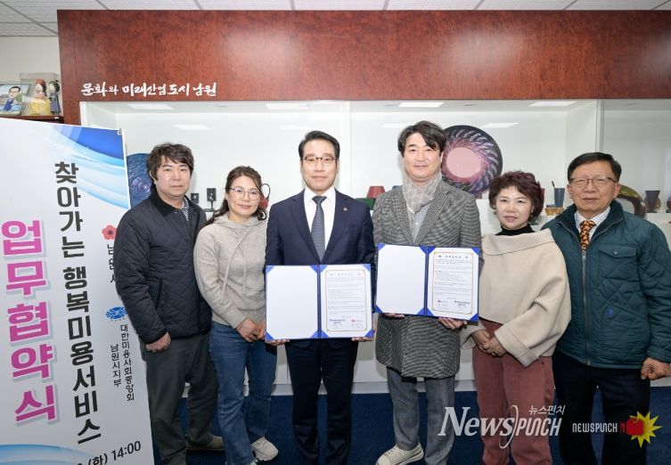 뉴스펀치 최영남 기자 | 남원시는 지난 10일 대한미용사회중앙회 남원시지부(지부장 김태)와 거동이 불편한 취약계층의 복지 증진을 위해 '찾아가는 행복미용 서비스' 추진을 위한 업무협약을 체결했다.