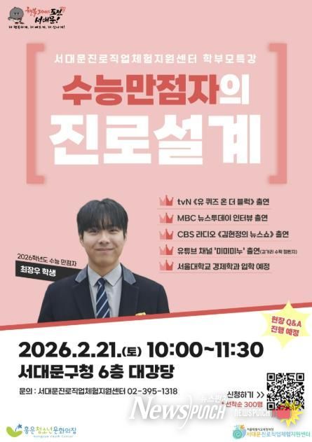 뉴스펀치 박상훈 기자 | 서대문구가 이달 21일 오전 10시부터 1시간 30분 동안 구청 6층 대강당에서 중고등학생과 학부모를 대상으로 ‘수능 만점자와 함께하는 진로 설계 특강’을 개최한다.