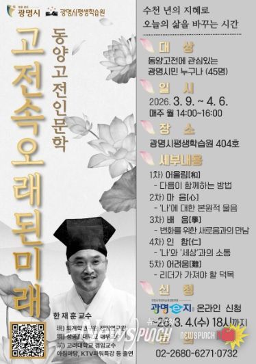 뉴스펀치 박상훈 기자 | 광명시 평생학습원은 오는 3월 9일부터 운영되는 광명지식상점 기획 강좌 ‘동양고전인문학: 인공지능(AI) 시대, 고전 속 오래된 미래’에 참여할 시민 40명을 모집한다.
