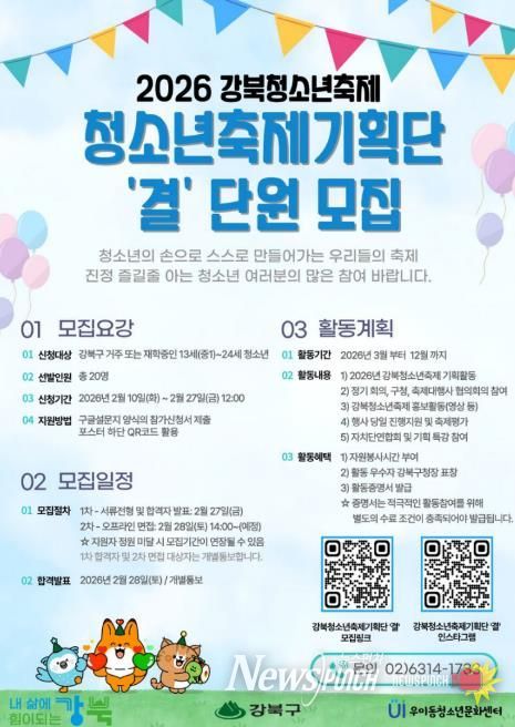 뉴스펀치 박상훈 기자 | 서울 강북구는 청소년이 축제의 주인공이 되어 기획부터 운영, 평가까지 전 과정에 참여하는 2026 강북청소년축제 ‘청소년축제기획단’을 모집한다.