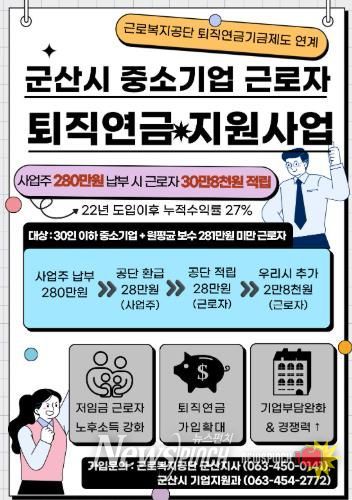 군산시는 여기에 더해, 공단이 근로자에게 적립해 주는 금액의 10%를 추가로 지원해 근로자 퇴직연금 계좌에 별도로 적립해 준다.