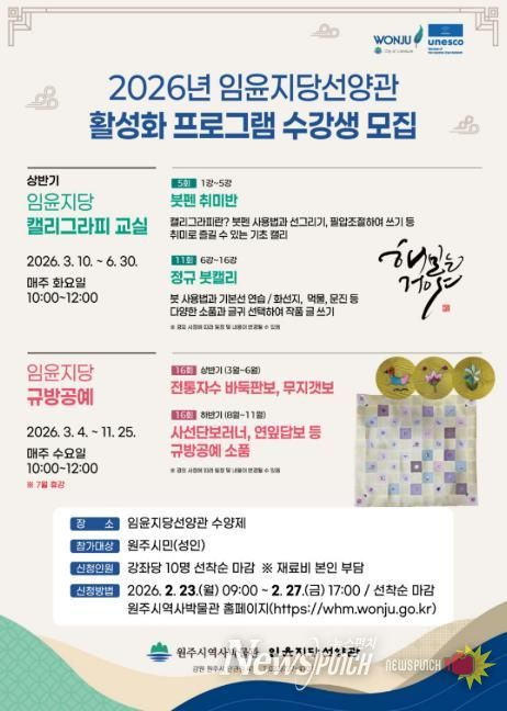 뉴스펀치 조평훈 기자 | 원주시 임윤지당선양관은 오는 3월부터 11월까지 선양관 활성화 프로그램으로 ‘임윤지당 규방공예’와 ‘임윤지당 캘리그라피’ 강좌를 운영한다.