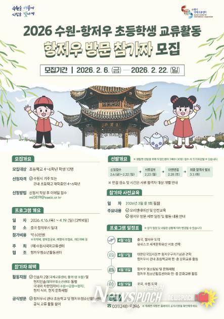 뉴스펀치 박상훈 기자 | 수원특례시는 ‘2026 수원–항저우 초등학생 상호방문교류’에 참여할 초등학생 10명을 2월 22일까지 모집한다.