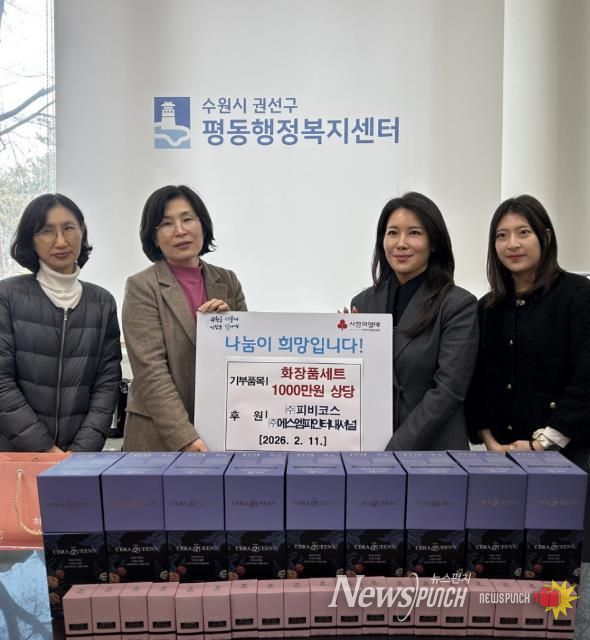 뉴스펀치 박상훈 기자 | 지난 11일, 권선구 평동 행정복지센터는 ㈜피비코스와 ㈜에스엠피인터내셔널이 약 1천만 원 상당의 세럼·크림·선크림 등 화장품세트를 공동 기부했다고 밝혔다.