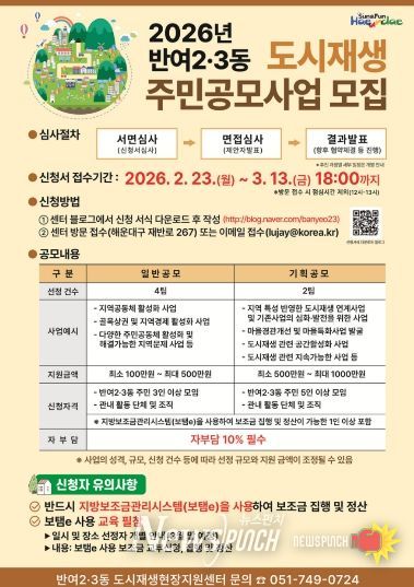 뉴스펀치 김윤걸 기자 | 해운대구 반여2·3동 도시재생현장지원센터는 ‘반여2·3동 도시재생 주민 공모사업’ 아이디어를 모집한다.