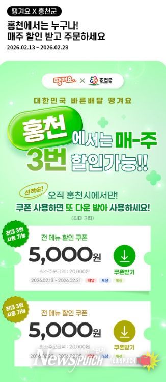 뉴스펀치 조평훈 기자 | 홍천군이 비상경제대책의 일환으로 지역 내 소상공인 매출 확대와 소비 촉진을 위해 신한은행의 공공배달앱 ‘땡겨요’와 손잡고 실질적인 지원에 나선다.