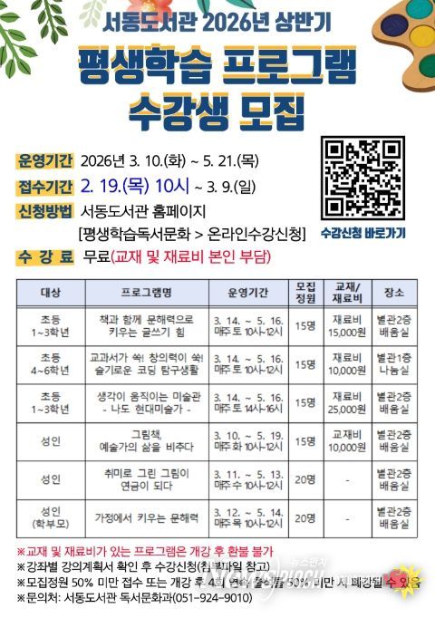 뉴스펀치 김윤걸 기자 | 부산시교육청 서동도서관은 3월 10일부터 5월 19일까지 서동도서관 별관에서 초등학생과 성인 100명을 대상으로 ‘2026년도 상반기 평생학습 프로그램’을 운영한다.